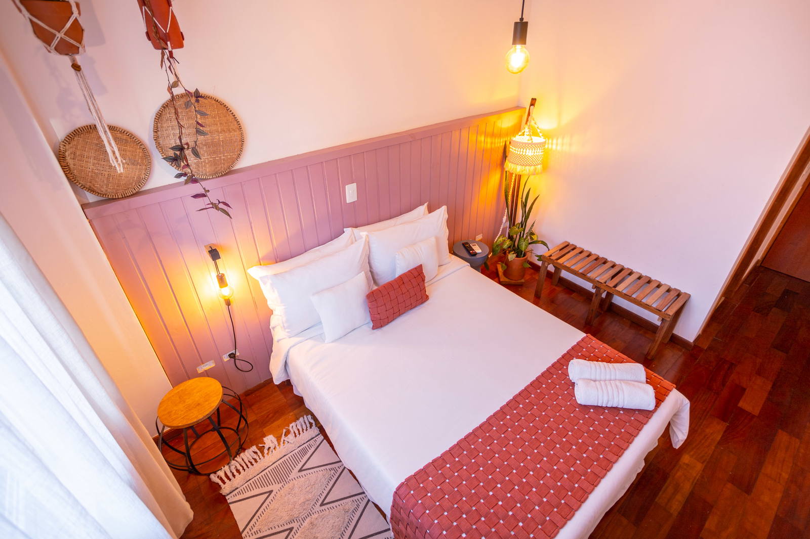 Se você quer a praticidade de pousada/hotel sem abrir mão de vibe, o Vilarejo é o ponto certo: quarto silencioso e privativo pra recarregar — e, a poucos passos, todo o ecossistema da Vila (piscina com toboágua, bar na floresta, eventos, trilhas e gente boa).